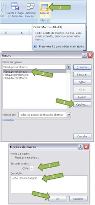 Na mesma janela em que mandamos executar a macro, podemos definir um atalho para ela, clicando em "Opções...". Na janela que aparece, podemos colocar o atalho (que pode ser Ctrl + uma letra, ou Ctrl + Shift + uma letra). Podemos também escrever uma descrição da macro. Clicando em Ok , o atalho da sua macro estará definido. Para usar a macro agora basta acionar o atalho, como se fosse qualquer outro atalho.