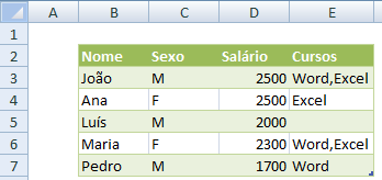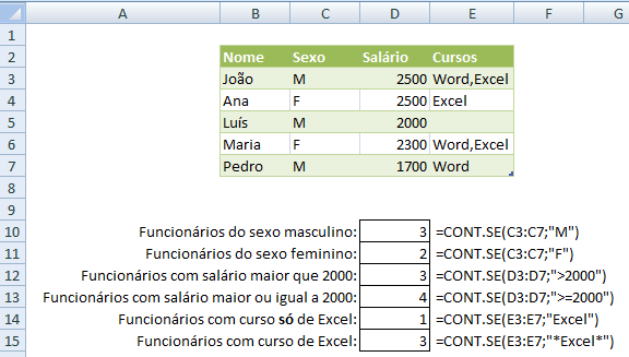 Por último, vamos calcular quantos funcionários possuem curso de Excel. A princípio, a gente pode pensar em fazer assim: =CONT.SE(E3:E7;"Excel") . No entanto, essa fórmula não é correta, pois contaria apenas aqueles funcionário cujo curso seja exatamente igual a Excel (no caso, Ana), mas não contaria os que também tem outros cursos (João e Maria). A fórmula correta seria assim: =CONT.SE(E3:E7;"*Excel*") .