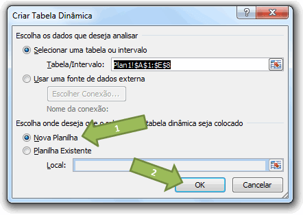 Em seguida irá aparecer uma janela onde você poderá selecionar a tabela que será usada (o que já fizemos), além de escolher onde será criada a tabela dinâmica. Para esse exemplo, vamos deixar a opção "Nova Planilha" e clicar em OK.