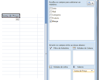 A primeira coisa a fazer é configurar o campo de "Valores", que normalmente contém valores numéricos. Em uma planilha escolar, o valor seria a nota do aluno. Em uma planilha de RH, seria o salário do empregado. Na nossa planilha de vendas de uma livraria, o valor será o Preço dos itens vendidos. Para definir isso, basta clicar-e-arrastar o campo "Preço" da parte superior do painel para a área de "Valores", no canto inferior direito do painel.