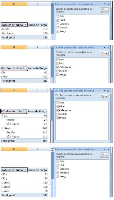É agora que a mágica acontece: para agrupar os valores por filial, basta selecionar o campo "Filial" na parte superior do painel da tabela. Para agrupar por categoria, é só selecionar "Categoria" em vez de "Filial". Pode agrupar por mais que um campo? Pode sim, veja os exemplos na figura abaixo.