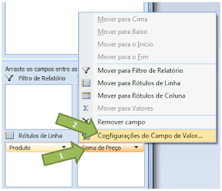 Até agora só vimos como fazer a tabela dinâmica que soma os valores agrupados, mas também é possível calcular média, valor máximo, entre outras opções. Para alterar o tipo de resultado, clique no valor que você está utilizando, no canto inferior direito do painel de tabela dinâmica, e escolha a opção "Configurações do Campo de Valor...".
