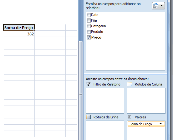 A primeira coisa a fazer é configurar o campo de "Valores", que normalmente contém valores numéricos. Em uma planilha escolar, o valor seria a nota do aluno. Em uma planilha de RH, seria o salário do empregado. Na nossa planilha de vendas de uma livraria, o valor será o Preço dos itens vendidos. Para definir isso, basta clicar-e-arrastar o campo "Preço" da parte superior do painel para a área de "Valores", no canto inferior direito do painel.