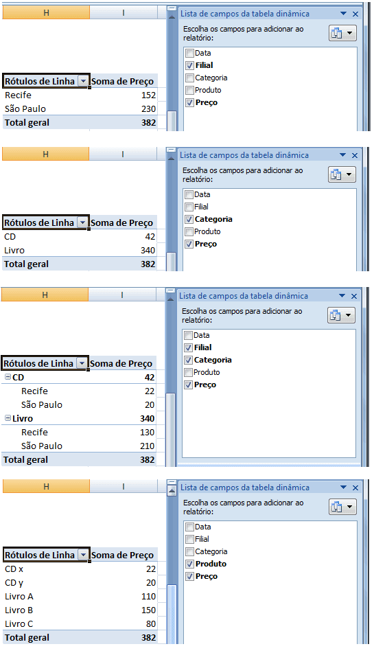 É agora que a mágica acontece: para agrupar os valores por filial, basta selecionar o campo "Filial" na parte superior do painel da tabela. Para agrupar por categoria, é só selecionar "Categoria" em vez de "Filial". Pode agrupar por mais que um campo? Pode sim, veja os exemplos na figura abaixo.